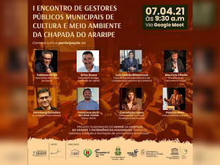 Gestores públicos municipais das área da Cultura e do Meio Ambiente da Chapada do Araripe estarão reunidos virtualmente nesta quarta-feira (7) por meio da plataforma do Google Meet. O evento é intitulado de I Encontro de Gestores Públicos Municipais de Cultura e Meio Ambiente da Chapada do Araripe.