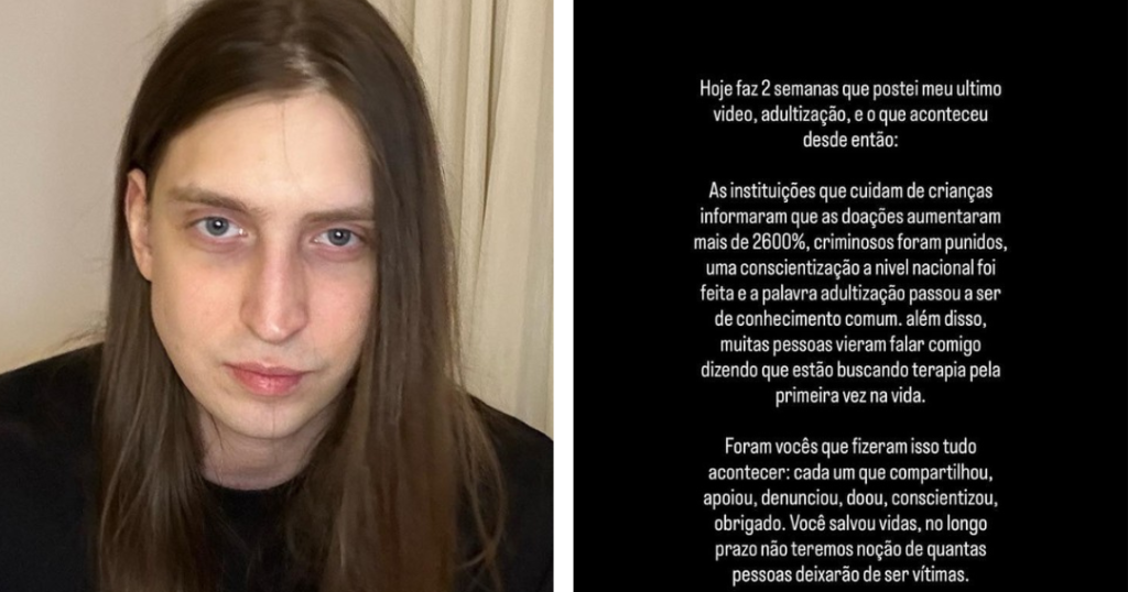 “As instituições que cuidam de crianças informaram que as doações aumentaram mais de 2600%, criminosos foram punidos, uma conscientização a nivel nacional foi feita e a palavra adultização passou a ser de conhecimento comum. além disso, muitas pessoas vieram falar comigo dizendo que estão buscando terapia pela primeira vez na vida. Foram vocês que fizeram isso tudo acontecer: cada um que compartilhou, apoiou, denunciou, doou, conscientizou, obrigado. Você salvou vidas, no longo prazo não teremos noção de quantas pessoas deixarão de ser vítimas” celebrou Felca.