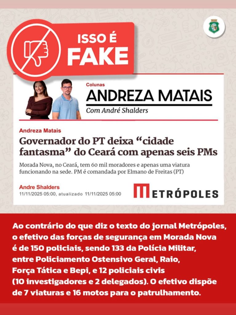 “Não procede a informação divulgada pelo jornal Metrópoles, de que apenas 6 policiais seriam responsáveis pela segurança em Morada Nova. Ao contrário do que diz o texto, o efetivo das forças de segurança no município é de 150 policiais, sendo 138 da Polícia Militar, entre Policiamento Ostensivo Geral, Raio, Força Tática e Bepi, e 12 policiais civis (10 investigadores e 2 delegados). O efetivo dispõe de 7 viaturas e 16 motos para o patrulhamento. O Governo do Estado do Ceará lamenta a desinformação e reafirma seu compromisso com a verdade e a democracia,” disse a nota.