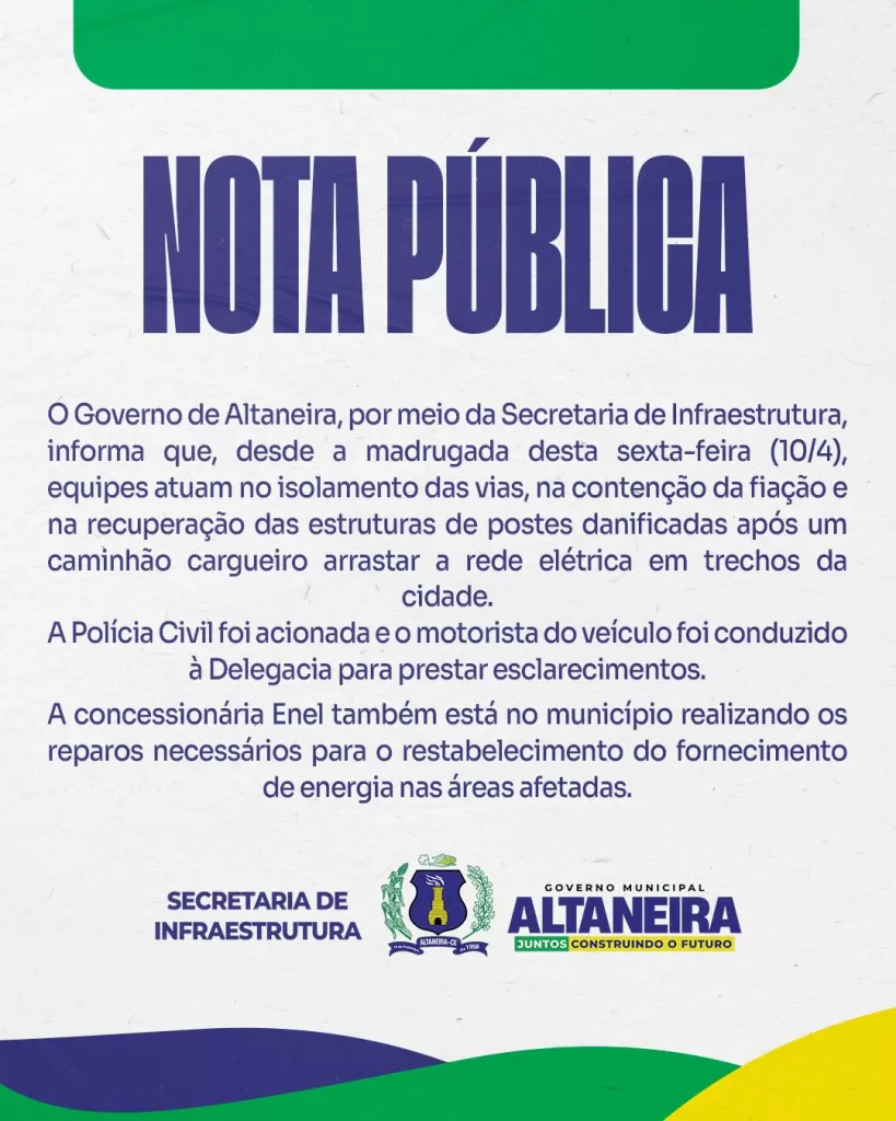 Equipes da Secretária de Infraestrutura foram até o local para fazer o isolamento da área. Ainda em nota, a pasta informou que a Polícia Civil foi acionada ao local e conduziu o motorista do veículo para prestar depoimento na delegacia. A assessoria de comunicação de Altaneira confirmou que os moradores da região continuam sem energia e sem internet. A Enel Distribuição Ceará foi ao local para iniciar os trabalhos de recuperação da rede elétrica e evitar riscos para a população.