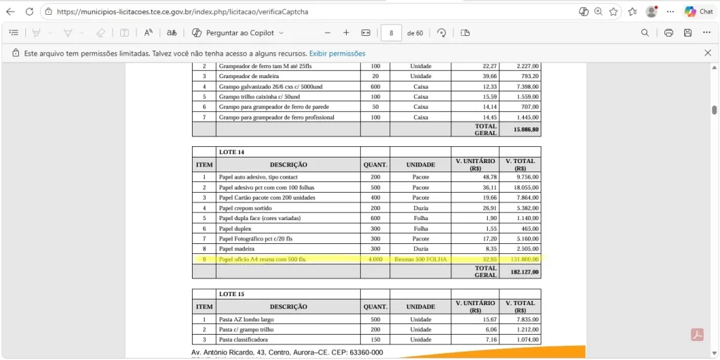 Entre os itens que mais chamam atenção está a compra de papel ofício A4, com previsão de aquisição de 4.000 resmas, ao custo unitário de R$ 32,95, totalizando R$ 131.800,00 apenas neste produto. O volume elevado e o valor final têm sido apontados por moradores como desproporcionais à realidade do município.